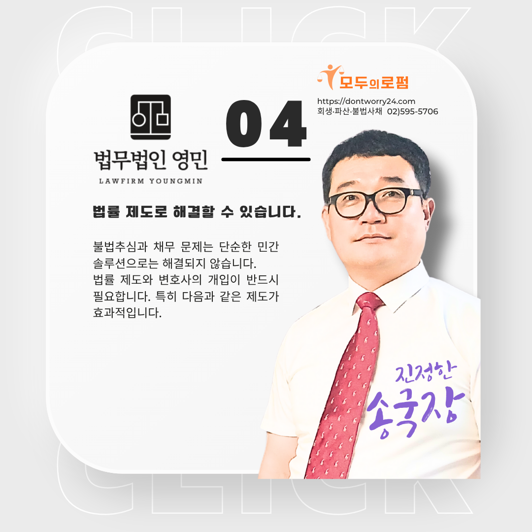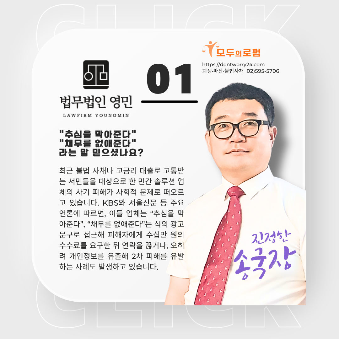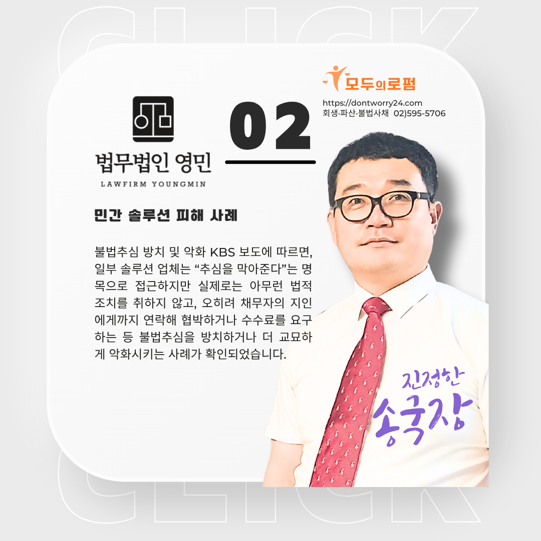 #민간솔루션업체 #민간솔루션업체불법 #불법추심 #대부계약무효 #이자무효 #채무자대리인 #개인회생 #파산면책 #불법사채 #법무법인영민 #모두의로펌