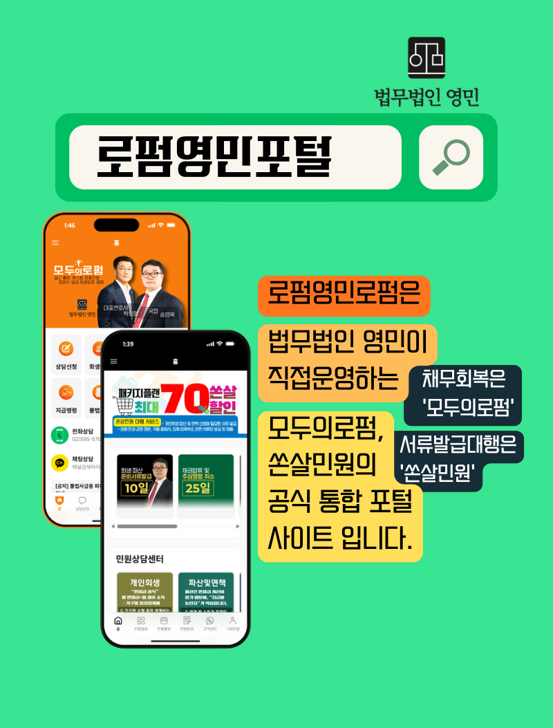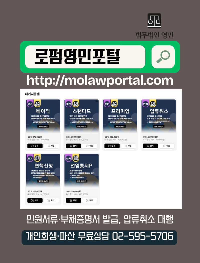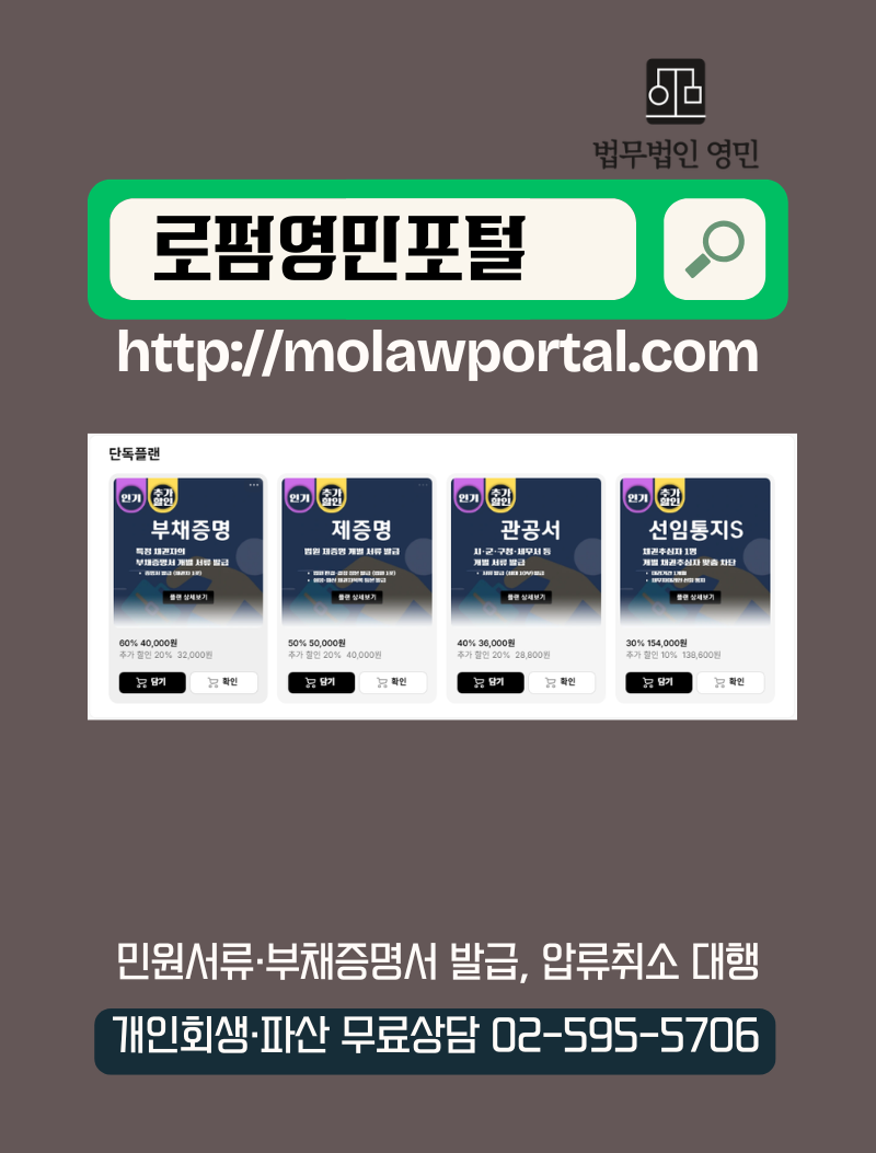 로펌영민포털은 법원·행정기관·금융기관에서 필요한 각종 서류를 대신 발급받아 드리는 전문 서비스 플랫폼입니다. 개인회생·파산·면책 등 복잡한 절차에 필요한 서류를 안전하고 신속하게 준비할 수 있도록 지원합니다.